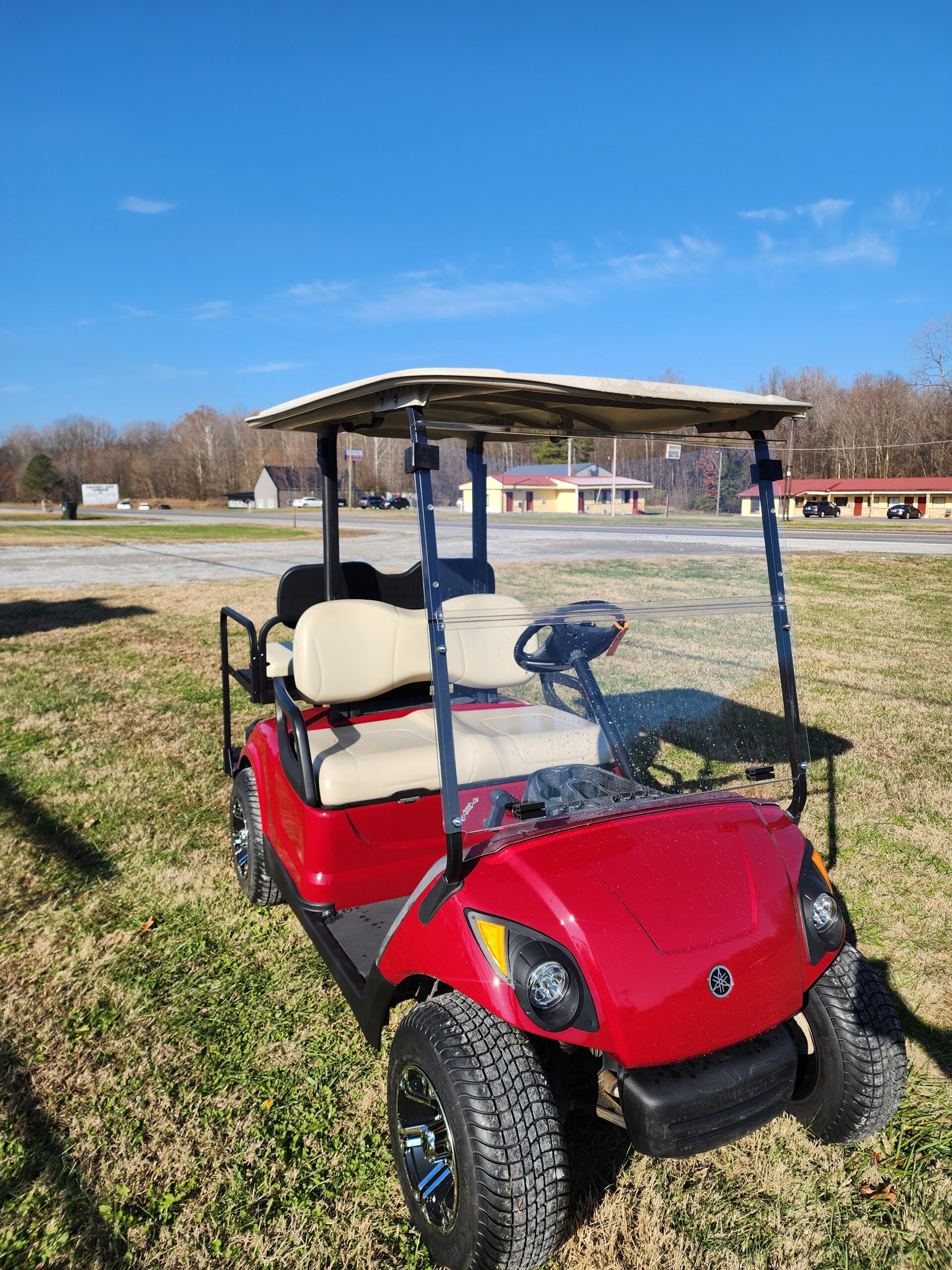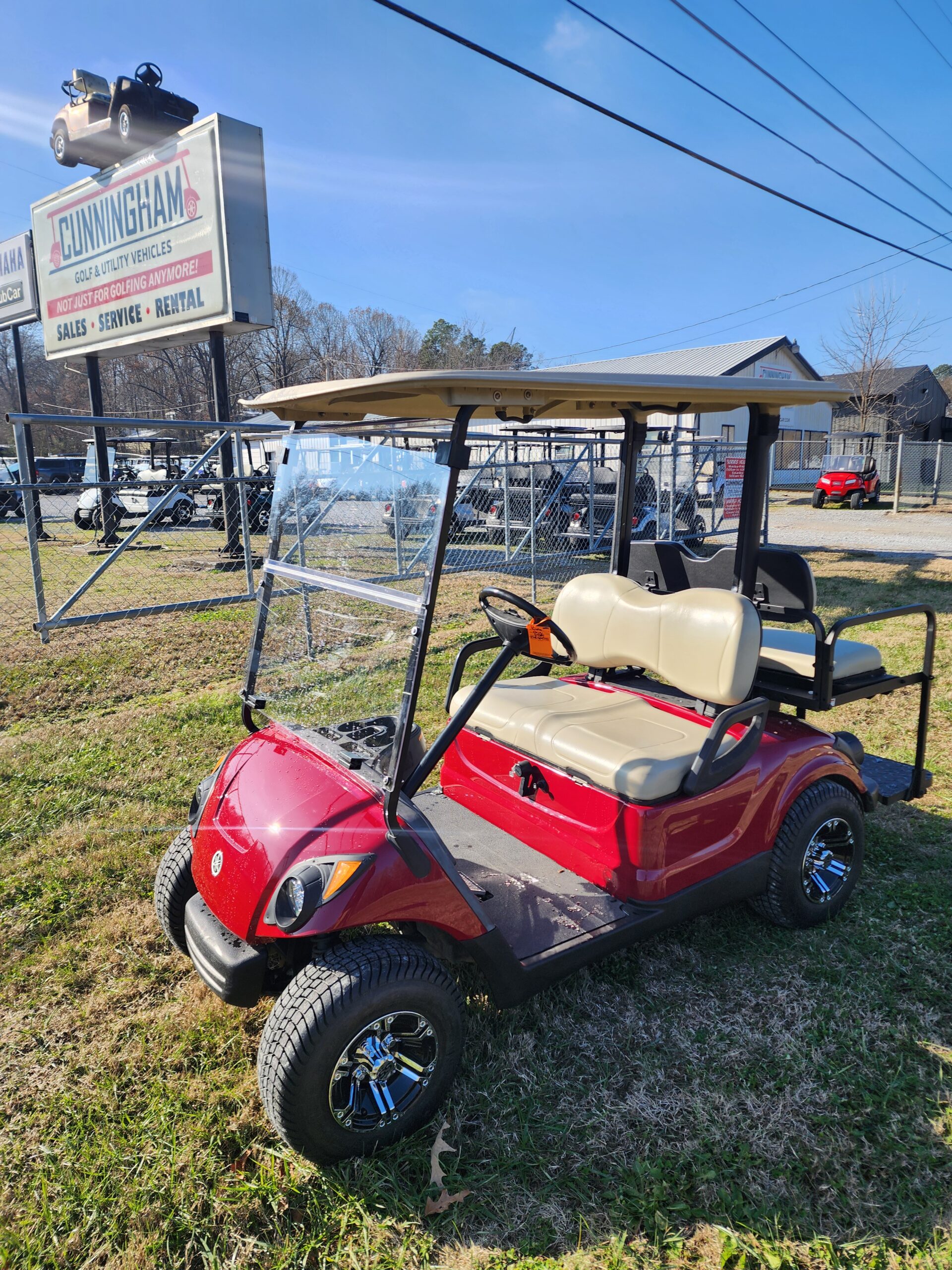 2015 Yamaha Golf-Car The DRIVE® Gas Garnet Red 4 passenger – The DRIVE golf car is plain and simple fun to drive.  In fact, its technology (and its spirit) has more in common with Yamaha motorcycles, ATV’s and performance watercraft than with ordinary golf cars. This unit has been Mechanically  reconditioned and features: a new rear facing seat and head and tail lights.